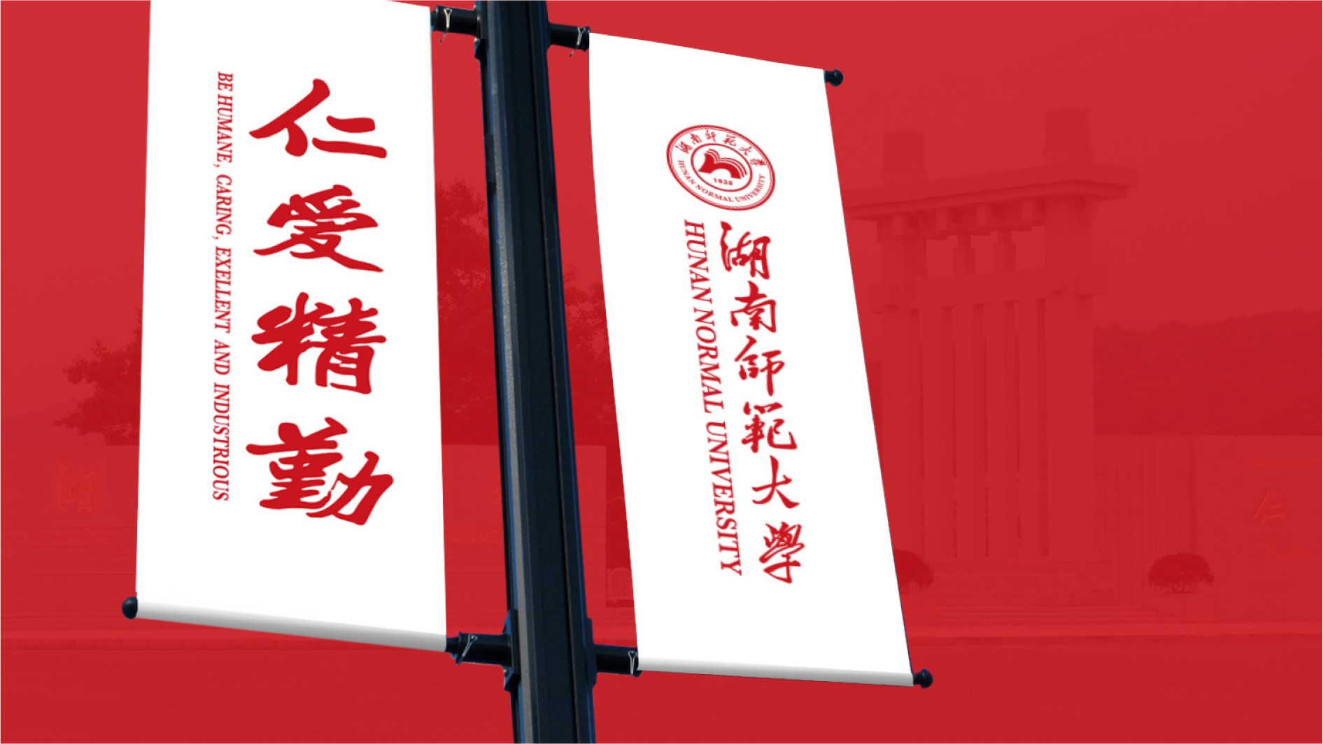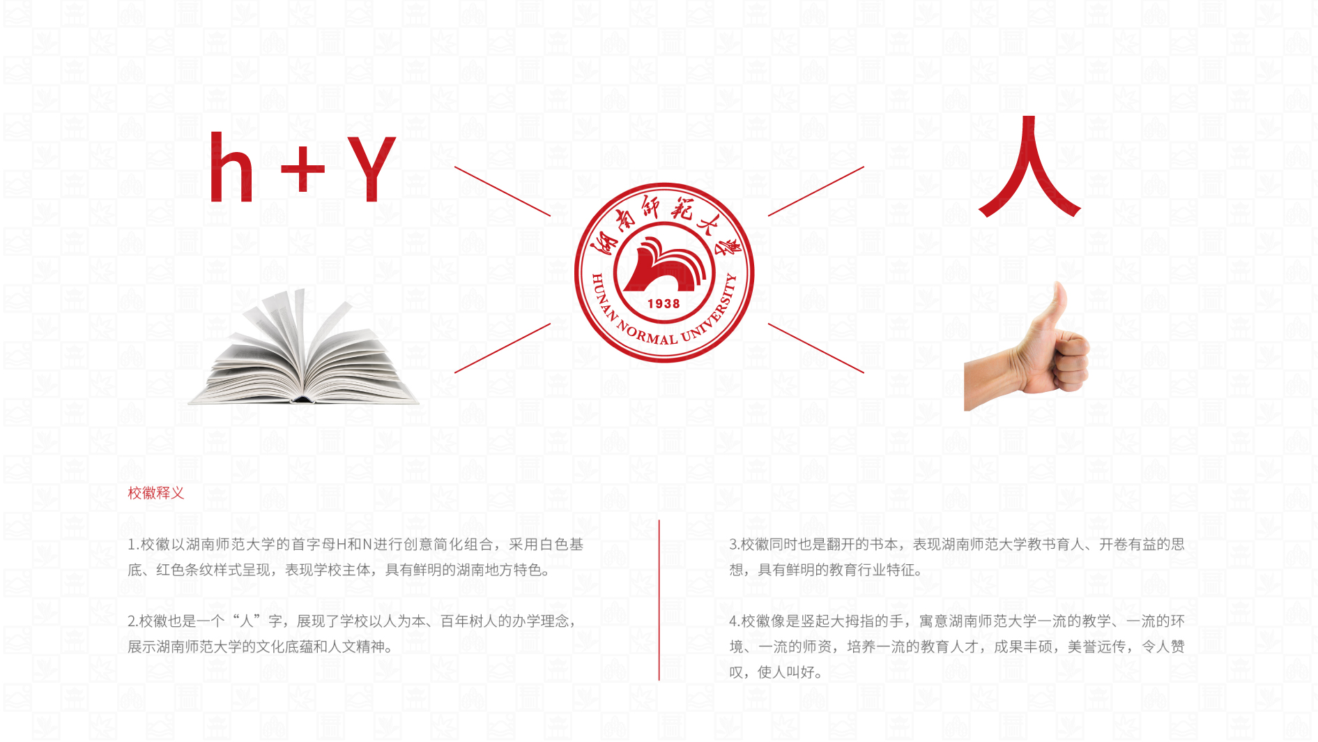校徽是學校的品牌標志,可以規范師生的行為,提高學校的知名度。和與德為湖南師范大學更新,校徽以湖南師范大學的首字母H和N進行創意簡化組合,具有鮮明的湖南地方特色;校徽也是一個“人”字,展現了學校以人為本、百年樹人的辦學理念;校徽也是翻開的書本,表現湖南師范大學教書育人、開卷有益的思想,具有鮮明的教育行業特征;校徽更像是豎起大拇指的手,寓意湖南師范大學一流的教學、一流的環境、一流的師資,培養一流的教育人才,令人贊嘆,使人叫好。