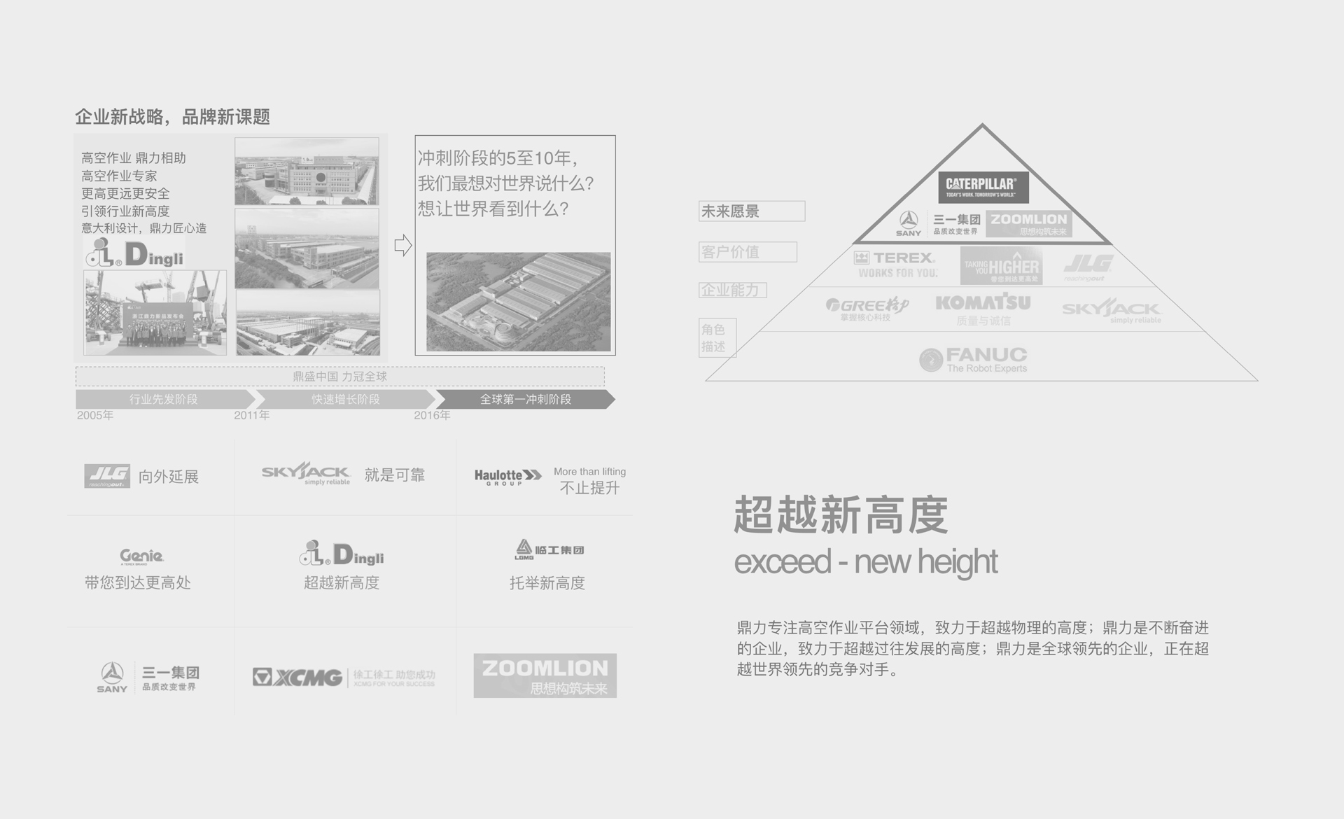 伴隨著戰略調整,如何確保鼎力機械與國際頂級品牌站在同一頻道上,又能夠體現企業自身基因與未來,是本次項目的挑戰。在雙方團隊的通力合作下,和與德經過嚴謹系統地對企業戰略、行業趨勢、競爭格局等方面的深入探究,賦予了鼎力機械全新的品牌主張——“Exceed-New-Height超越·新高度”。這成為一個推動和諧的容器,有效推動鼎力機械從中國第一到世界第一的戰略實施,有力地提升了品牌價值,從而使鼎力機械更好地聚焦“鼎盛中國,力冠全球”的使命,跨步前行!