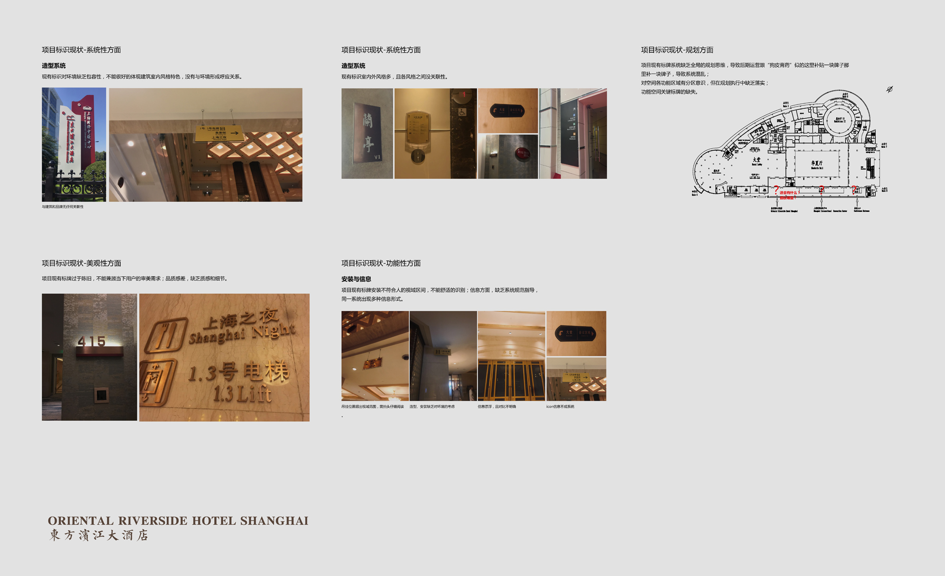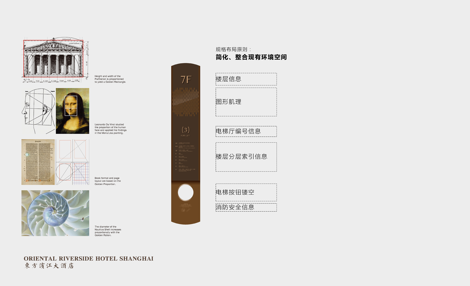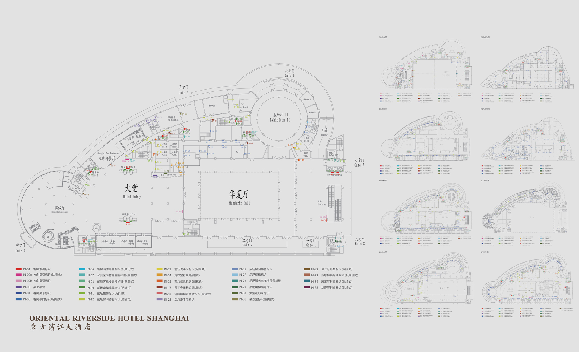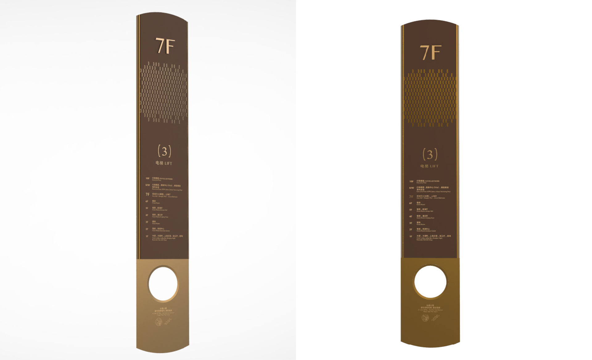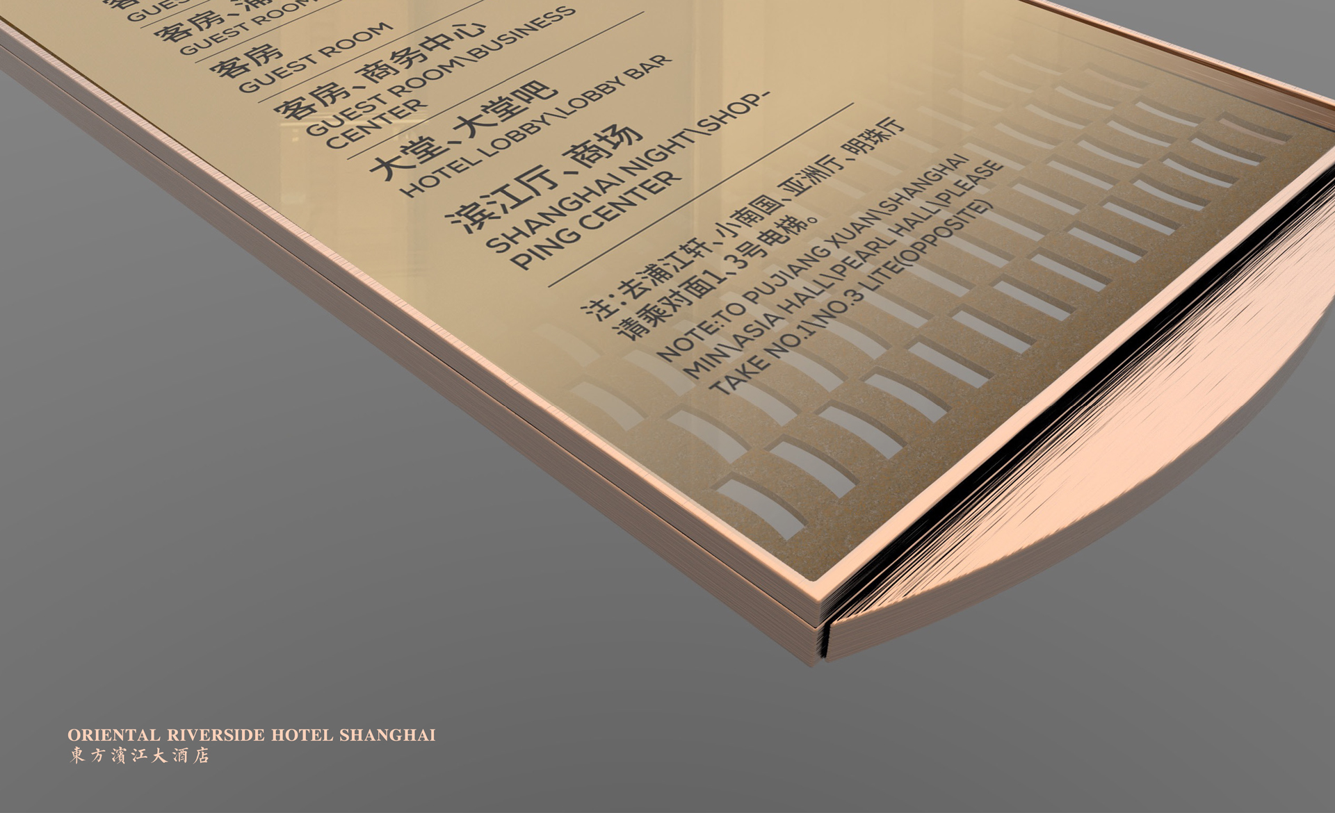 原有導視系統在視覺層面和功能層面存在的缺少系統性、美觀性及全局性的問題,不但影響了客戶日常運營管理工作,而且影響了其所接待的客人對其整體形象的認可度。和與德在充分了解其需求后,提出了相應的導視系統提升建議及方案,視覺層面側重考慮上海國際會議中心獨有的建筑環境空間特色,結合聚、散、流,從LOGO中演化輔助圖形,并通過漸變等工藝建議,以凸顯其品質感;功能層面側重從各樓層中的功能布局及各分區的關聯性出發,系統性地進行規劃布點,力求實現不同人群的導向需求。