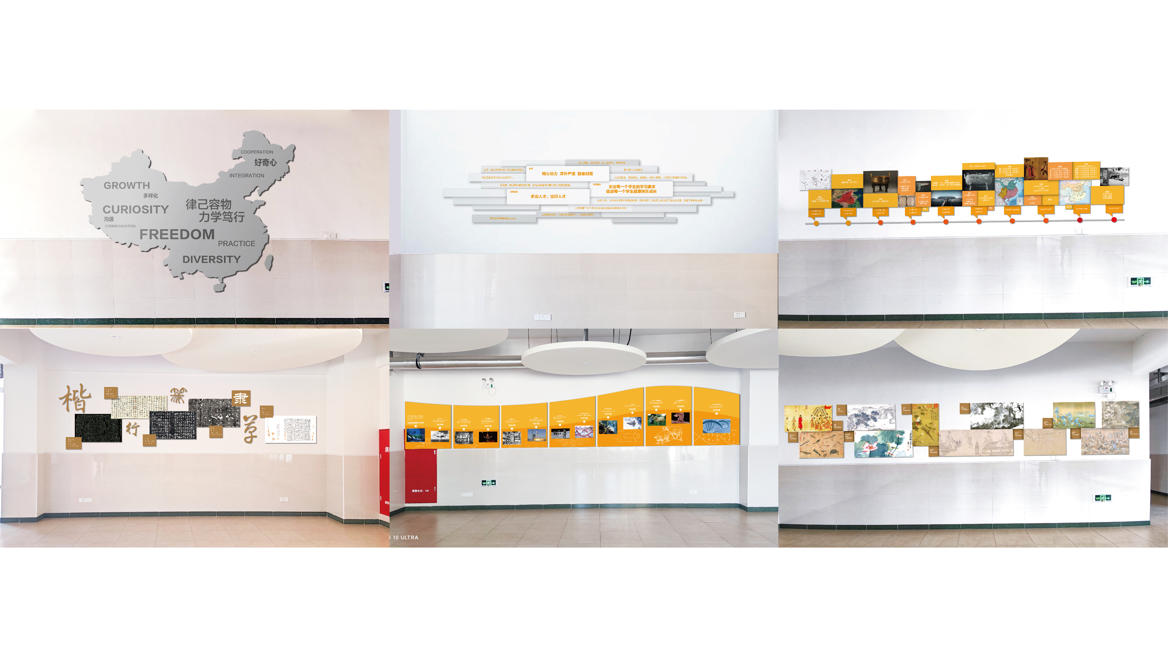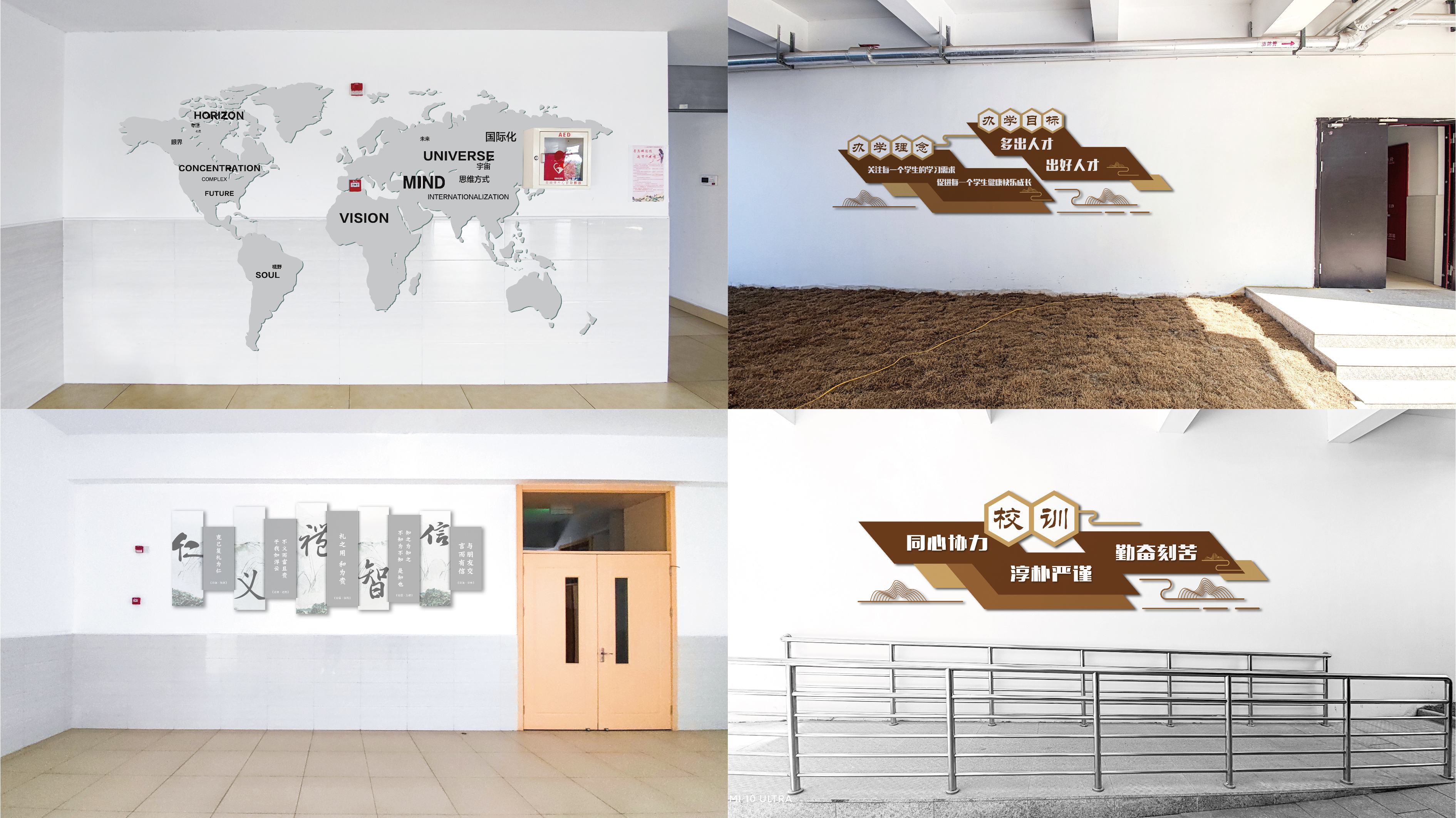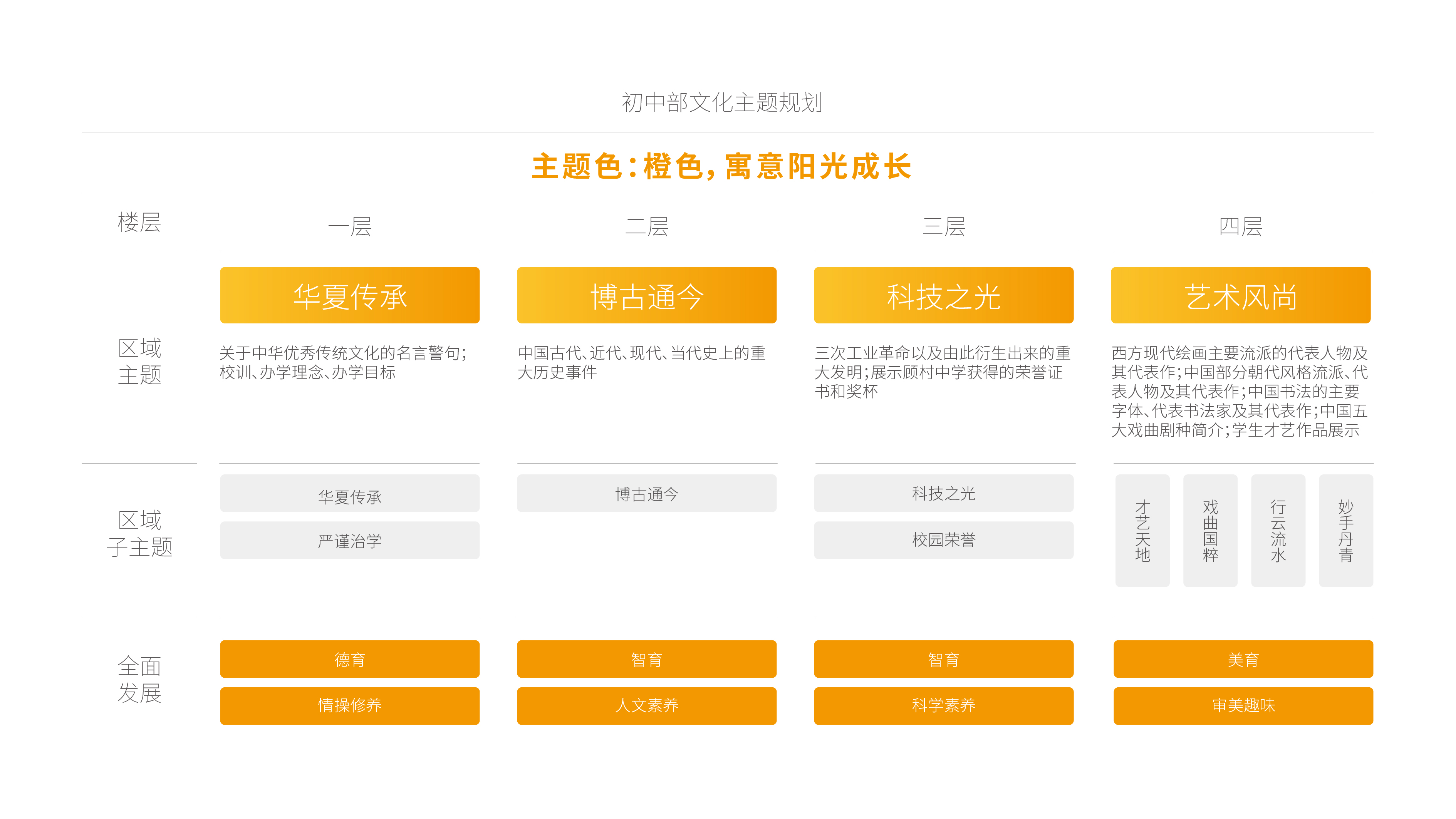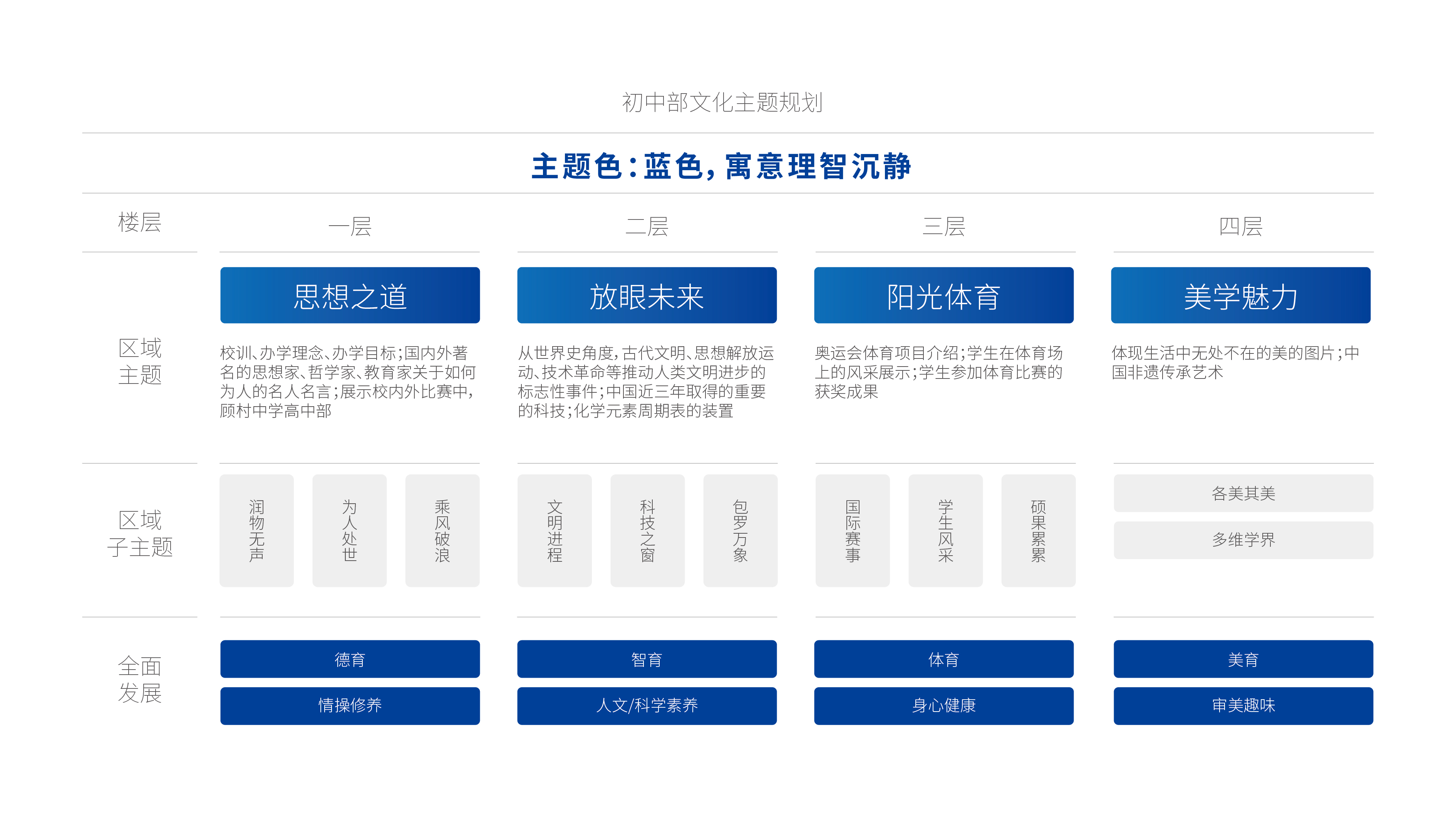 和與德應邀作為顧村中學的設計服務商對初中部的文化主題和導視進行了規(guī)劃、設計與落地,以德育、智育、美育三大功能為核心對不同樓層、不同區(qū)域的主題進行合理規(guī)劃,提升學生的全面發(fā)展能力,以此確定文化內(nèi)容和設計風格,并協(xié)助落地。